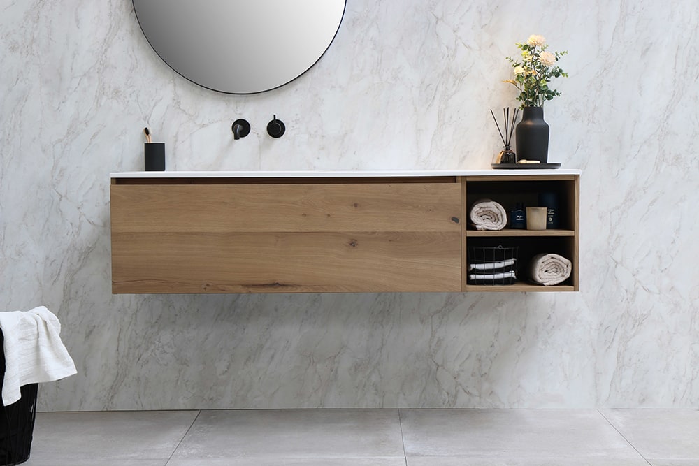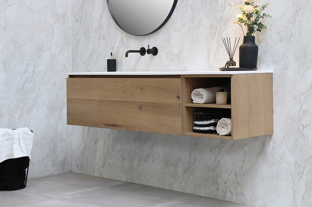 Onderkast één lade greeploos fineer eiken. Verkrijgbaar in zes verschillende breedtematen en in combinatie met twee meubels uit te breiden tot een breedte van 180 cm. Verkrijgbaar in vier verschillende fineer kleuren.
