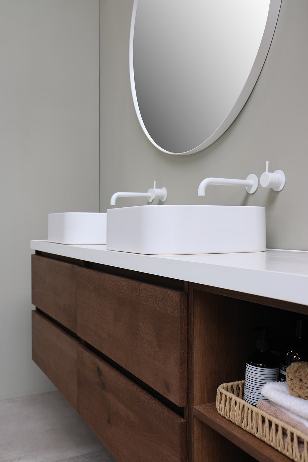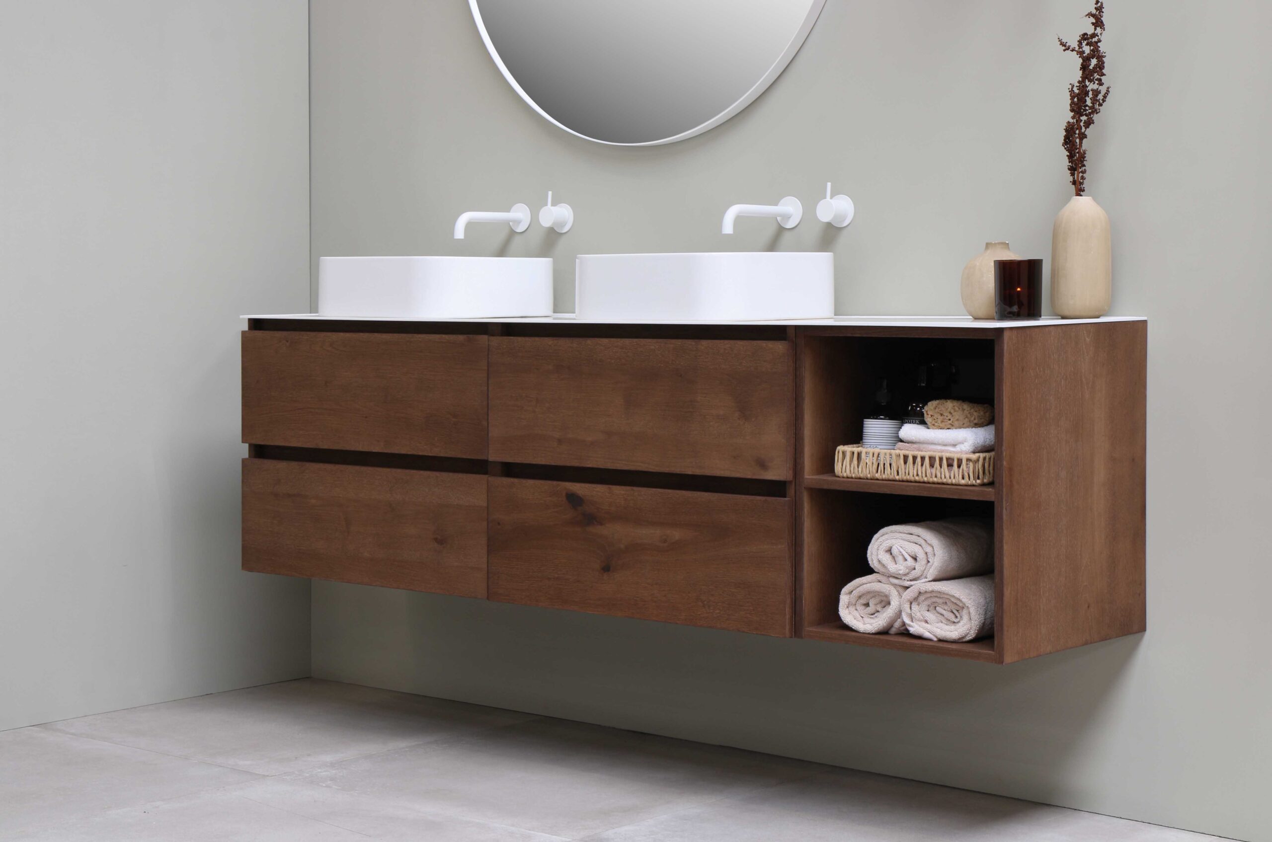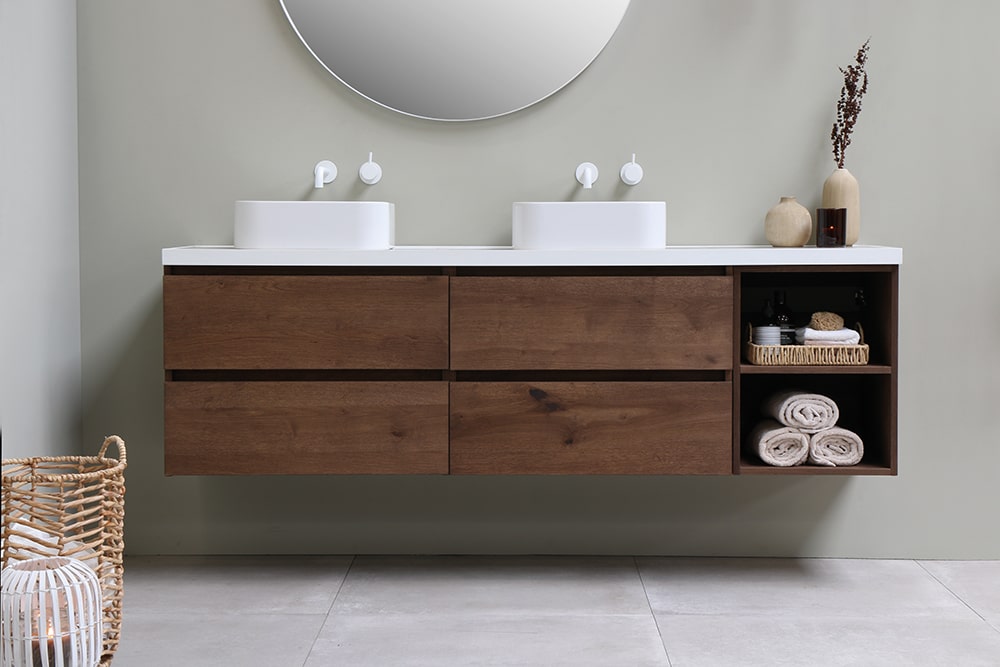 Deze onderkast is met twee softclose lades dé perfecte oplossing voor het opbergen van alle badkamerspullen. Verkrijgbaar in zes verschillende breedtematen en in combinatie met twee meubels uit te breiden tot een breedte van 180 cm. Verkrijgbaar in vier verschillende fineer kleuren.